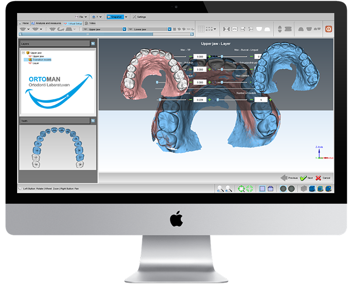 Hasta modeli dijital ortama aktarılarak, bilgisayar programı ile analizler yapılır ve Ortodonti uzmanı veya Diş Hekimin isteği doğrultusunda set-up işlemi yapıldıktan sonra, detaylı analiz sonuçları ve fotoğrafları Hekim onayına sunulur. Onay alındıktan sonra 3 boyutlu modeller elde edilerek plaklar hazırlanır.